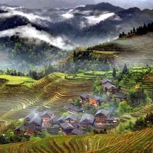 Départ vers la région des rizières en terrasse de Longsheng ou Longji (l’Epine Dorsal du Dragon), au nord de Guilin, rassemblées notamment autour du village de Ping’an et de Dazhai. L’arrivée se fera en contrebas du village, que vous atteindrez à pied après 30 minutes de marche (porteurs à disposition). Installation dans votre auberge en bois.