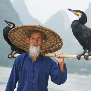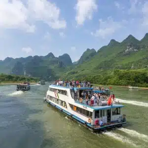 Traversée de la rivière avec le bac local et découverte de la vieille rue de Xingping à la découverte d’un artisan préparant des breuvages à bases d’alcool de riz aromatisé, notamment par des fleurs d’osmanthus, l’emblème de Guilin (certaines boissons renferment des serpents et des scorpions. Possibilité en option d’assister à leur préparation sur demande – cœurs sensibles s’abstenir !). Déjeuner de spécialités locales dans une auberge du village (Escargot à la menthe, Lipou Taro…) et dans l’après- midi effectuez une petite balade en radeau sur l’une des plus belles portions de la rivière Li entre Xingping et la colline des 9 chevaux, à travers des petits villages de pêcheurs, rizières et bosquets de bambous (0h45 de croisière environ). C’est un paysage de cette portion qui a inspiré l’illustration du billet de 20 yuans chinois.