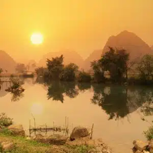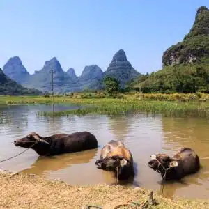 Après le petit déjeuner départ en véhicule jusqu’à l’exploitation de thé des sept étoiles. Découvertes des champs de thé et montez au sommet du point panoramique pour une vue sur les colline et le site de la rivière Li classée au patrimoine mondial de l’UNESCO. Retrouvez le véhicule qui vous déposera 5km plus loin au départ d’un sentier que vous emprunterez à pied à travers les vergers d’agrumes et petits hameaux jusqu’au village de Xingping (1h30 à 2h00 de randonnée). Le chemin offre une belle perspective sur la rivière. Vous visiterez également un petit temple blotti sur les berges à l’entrée de la grotte de l’Escargot où vivent encore quelques moines.