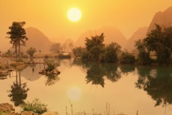 - Option B : Assistez au lever du soleil depuis la colline de la montagne de la Chienne (Gouposhan) qui se trouve en aval du village de Xingping sur l’autre rive. Son accès est sauvage, avec des passages dans les buissons et des rochers à escalader, non aménagés. L’endroit est quelque peu gardé secret mais réputé auprès des photographes à la recherche de superbes levers de soleil.