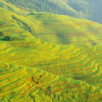 Tôt le matin assistez à un superbe lever de soleil sur les rizières de l’Epine Dorsale du dragon. Continuation des visites autour de Longji puis transfert en véhicule (1h de route) au coeur des rizières en terrasses de Jingkeng et des villages de Tiantouzhai et de Dazhai. Rencontre avec les femmes Yao, célèbres pour leurs beaux costumes roses brodés, leurs lourds bijoux et leurs longs cheveux touchant parfois le sol ! Retour à votre hôtel à Ping’an (ou en hébergement plus standard à Tiantouzhai (Dazhai) : réduction de 100RMB par chambre).