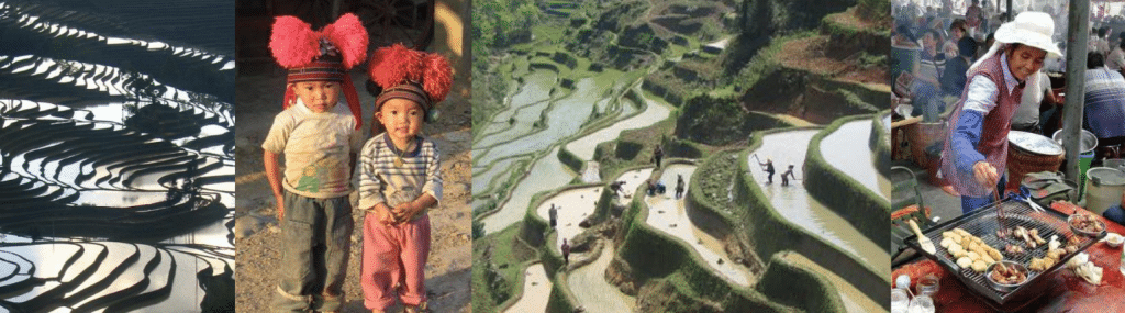 Profitez de votre petit-déjeuner avec vue sur les rizières souvent baignées par la brume matinale, pour une atmosphère reposante. Puis vous irez au marché local. Aujourd’hui se tient celui de Shengcun. Vous pourrez y rencontrer les minorités Yi et Hani portant encore leur costume traditionnel. Continuation jusqu’à un petit village de la minorité Yi, pour un déjeuner festif avec les villageois. Cet après-midi, marche à travers de beaux paysages de rizières en terrasses. Vous traverserez de petites bourgades pittoresques. Coucher de soleil sur les rizières. Dîner. Nuit au Twelve Manor.