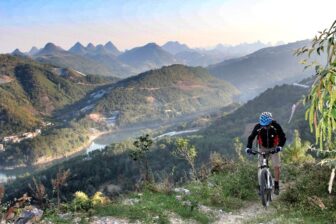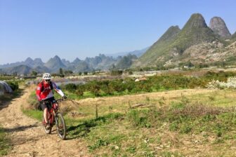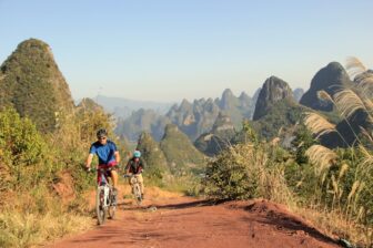 Guidé par un cycliste expérimenté, le programme d’aujourd’hui vous amène au nord de Yangshuo au cœur des plus grandes montagnes karstiques de la région jusqu’à la bourgade de Xing Ping. La journée commence sur du plat entre les parcelles de rizières et sur les berges de la rivière bordées de bambous, pour ensuite amorcer une montée sinueuse à travers les rizières en terrasses, les plantations de thé et les vergers d’agrumes, quelques centaines de mètres au-dessus de la vallée de la rivière Li. Le plus gros des efforts sera fourni sur ces 20 premiers kilomètres, et vous pourrez alors vous détendre un peu et profiter des vues spectaculaires. Le pique nique, préparé et emporté par votre guide, pourra se prendre sur l’un de ces sites panoramiques.