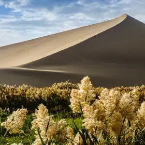 Route en véhicule vers Dunhuang (environ 5 heures). Excursion vers les dunes géantes des Sables Chantants de Mingsha entourant le lac du Croissant Bleu, là où l’oasis rencontre le désert. Découverte du soleil couchant sur les dunes en route. Nuit à l’hôtel Silk Road 5*, superbe hôtel de charme à la lisière du Désert rappelant les caravansérails.