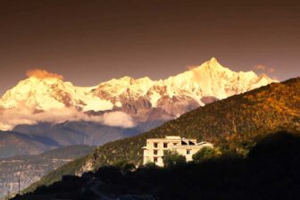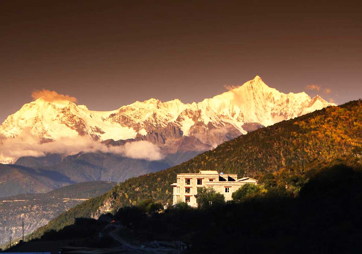 Départ vers 09h00 et matinée culturelle à Cizhong avec visite guidée de l’église catholique Sainte-Thérèse, joyau architectural néo-gothique construite en 1867. Votre guide francophone spécialisé vous expliquera l’histoire fascinante de la mission française et l’adaptation du christianisme aux traditions tibétaines. Découverte des vignes introduites par les missionnaires et dégustation de leur vin primé. Départ vers 11h30 pour Dêqên via la route panoramique du Lancang. Arrêt photo au col de Wunongdong (3 800 m) avec vue spectaculaire sur les pics enneigés. Arrivée à Dêqên vers 15h00, installation à l’hôtel avec chambres vue montagne. Fin d’après-midi consacrée à l’observation du Kawagarbo (6 740 m), pic sacré des Tibétains, depuis le parc Feilai Temple. Coucher de soleil saisissant sur la chaîne de Meili selon la saison.