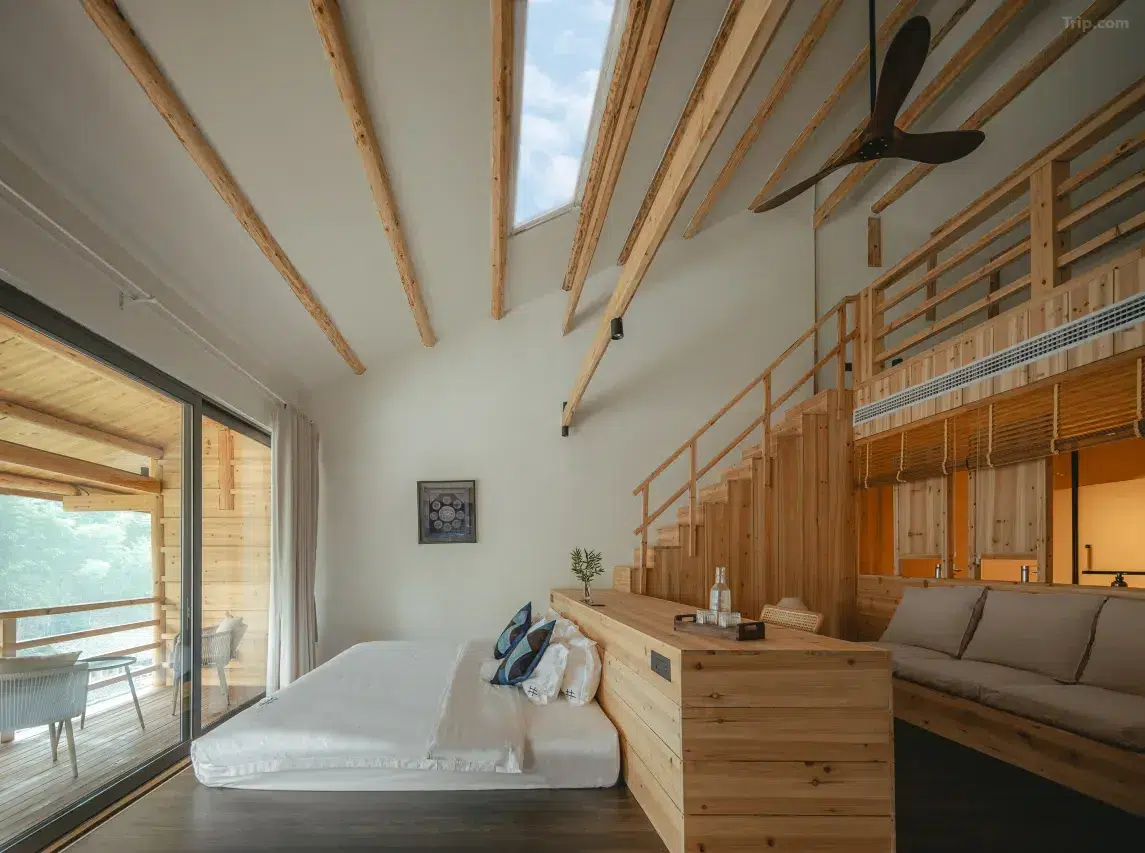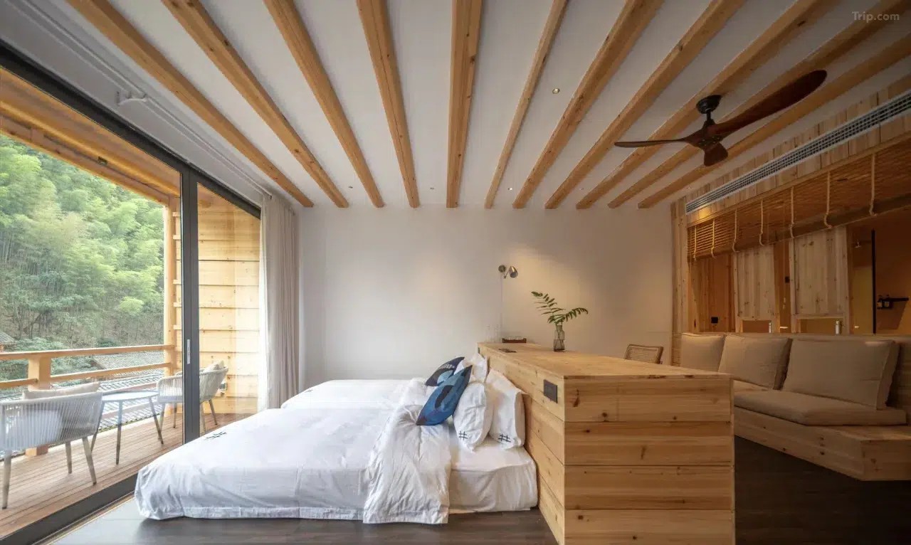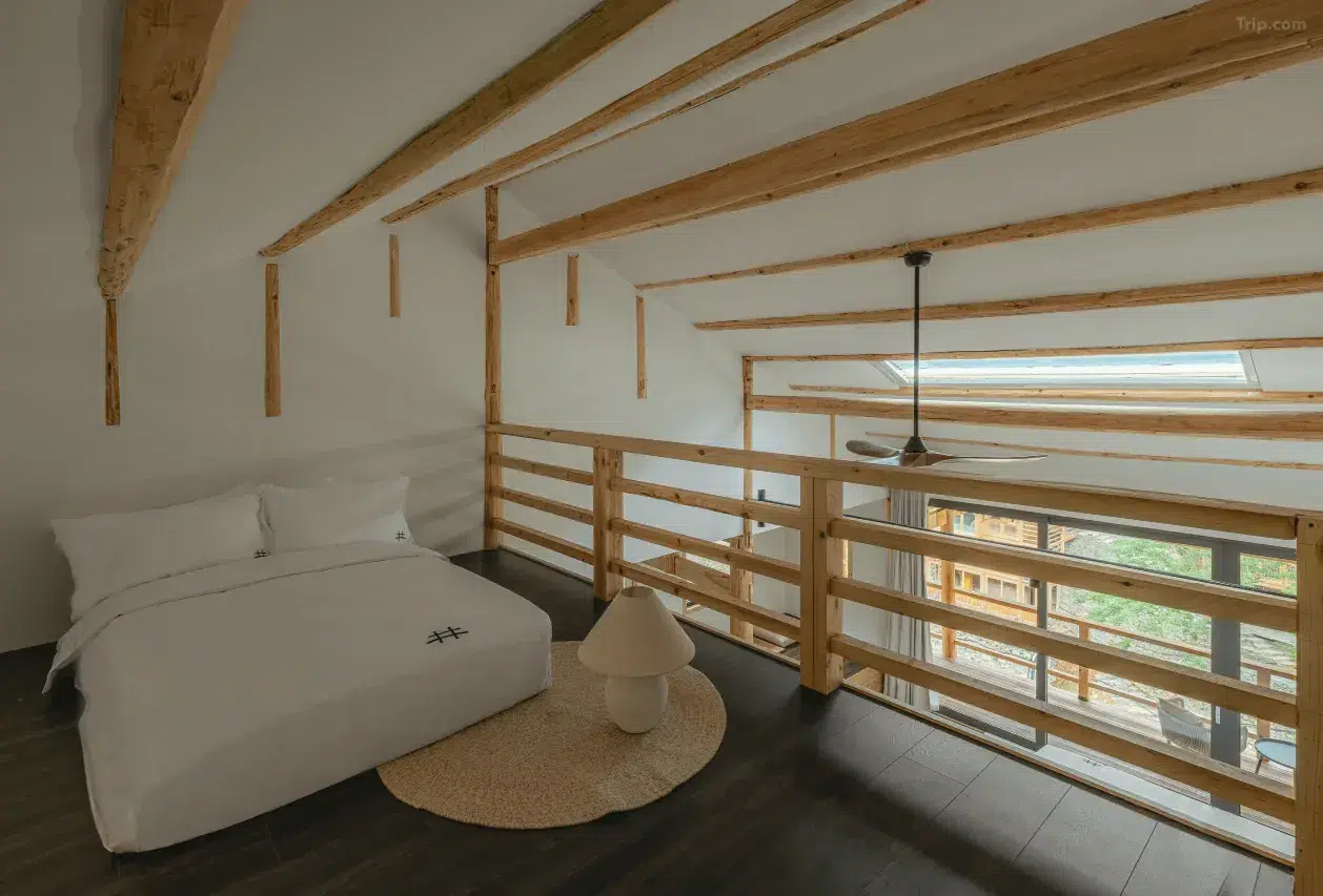 Les chambres, au design moderne et élégant, offrent souvent une vue panoramique sur le village. Elles sont équipées d’aromathérapie, parfois de baignoires panoramiques, et certaines disposent de balcons et de sources chaudes privées. Le confort est assuré par des équipements haut de gamme tels que des sèche-cheveux Dyson et des toilettes intelligentes. L’hôtel propose également un restaurant, un bar, et un accès à un bain à remous.