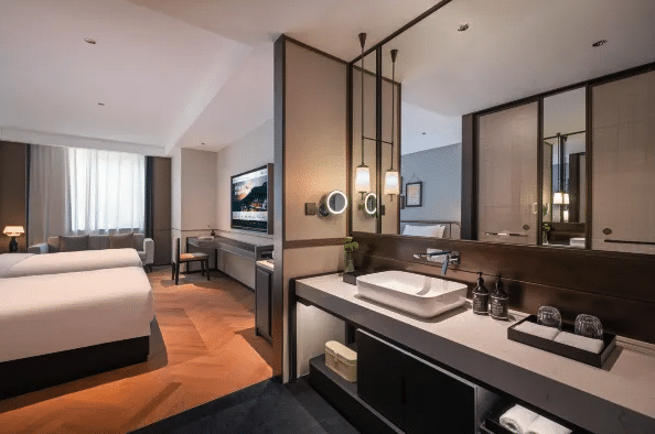 Blossom House propose 11 catégories de chambres, chacune conçue comme une demeure privée d’époque. La Deluxe Family Room (35-40 m², étages 1-3, 1 lit double + 1 lit simple) offre espace généreux pour familles. La Tai Chen Deluxe Twin Room avec Smart Projection (35 m², 2 lits simples) combine commodités modernes (projection intelligente, toilettes intelligentes, produits APPELLES haut de gamme) avec esthétique classique. La Cheng Xin Deluxe Double Room avec Features Premium (40-50 m², lit queen-size) propose baignoire luxueuse, projection intelligente et toilettes technologiquement avancées. La Family Room (30-35 m²) offre flexibilité pour groupes. Tous les types bénéficient de Wi-Fi gratuit, climatisation, salle de bains privative, réfrigérateur, minibar, et fenêtres. Les services incluent piscine intérieure, salle de gym gratuite, buanderie gratuite en sous-sol, salon de thé, bibliothèque unique, salle de cardroom, restaurant « Hua Jian Shi » (petit déjeuner buffet occidental/chinois/asiatique, 7h00-10h30), café, bar, salon d’ateliers artisanaux traditionnels (classes d’artisanat intangible, workshops de heritage culturel).
