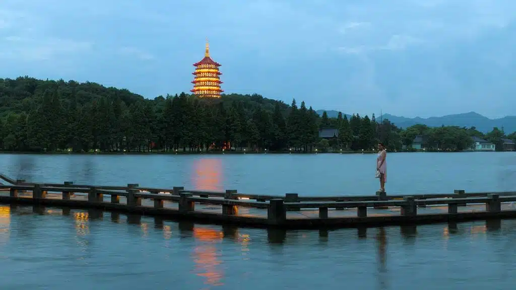 La Pagode Leifeng est situé au Sud du Lac Xi à Hangzhou et offre un magnifique panorama sur Hangzhou et le Lac Xi depuis son sommet.Construite en 977 sous la dynastie Song du Nord, elle est successivement endommagée puis rénovée. Elle est finalement laissée à l’abandon suite à une invasion de pirates et les briques qui la composent sont volées une à une sous la dynastie Qing et le début de la République de Chine. En 1924 la tour s’écroule définitivement. Des travaux de fouilles commencent sur le site de l’ancienne pagode en 2000 et la construction d’une nouvelle pagode au dessus du site de l’ancienne est achevé en 2002.L’actuelle pagode de 72 m de haut est composée de 3 parties :- Le piédestal dans lequel ont peut voir les ruines de l’ancienne pagode protégées par des vitres transparentes,- Le corps de la pagode que l’on peut explorer par des escaliers ou par des ascenseurs,- Le sommet de la pagode qui offre une superbe vue sur le Lac Xi et Hangzhou.Les reliques de l’ancienne pagode sont conservées dans le piédestal et raconte notamment l’histoire d’amour entre un jeune érudit et une femme qui n’est autre que la transformation d’un serpent blanc.