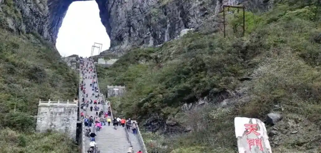 Situé à Zhangjiajie, le Mont Tianmen est célèbre pour l’énorme ouverture qui traverse la montagne et appelée Porte du ciel (天门 Tianmen) en chinois. Il s’est d’ailleurs vu traversé en plein air en 2011 par l’anglais Jeb Corliss équipé d’un Wingsuit. Plus haut sur le mont on peut visiter un temple semblable à celui qui avait été érigé à la même place sous la dynastie Tang.