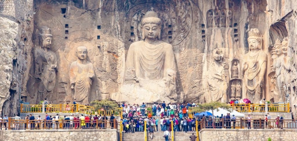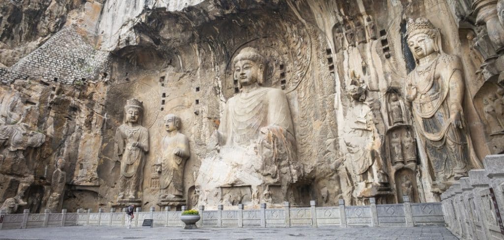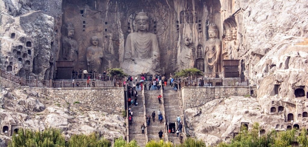 Au Sud de la ville de Luoyang, les Grottes de Longmen s’étalent sur environ 1 km. De magnifiques statues bouddhistes ont été creusées dans le calcaire. Le cadre est sublime avec le Mont Xiang Shang d’un côté, le Mont Longmen Shan de l’autre et le Fleuve Jaune au milieu. La construction a commencé à la fin du Vème siècle et dura pas moins de 400 ans.La falaise où se trouvent les grottes fait près de 1 000 m de longueur et il y a plus de 2 100 grottes où plus de 100 000 statues de Bouddha ont été sculptées. La plus grande mesure 17 m de hauteur et la plus petite seulement 2 cm ! La Grotte de Fengxianxi est probablement celle qui présente le travail le plus abouti. La finesse des détails est tout simplement stupéfiante.En plus des statues, vous trouverez de nombreuses stèles et une quarantaine de dagobas. A savoir que les grottes sont pour la plupart fermées au public mais il est quand même possible de s’approcher relativement près des statues et d’admirer ces chefs d’œuvre sans problème.