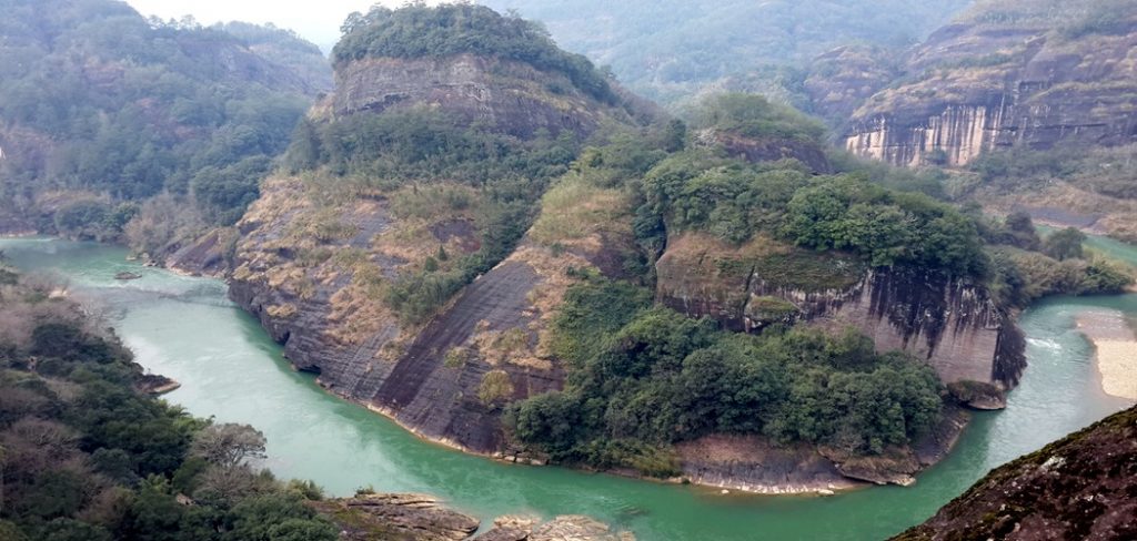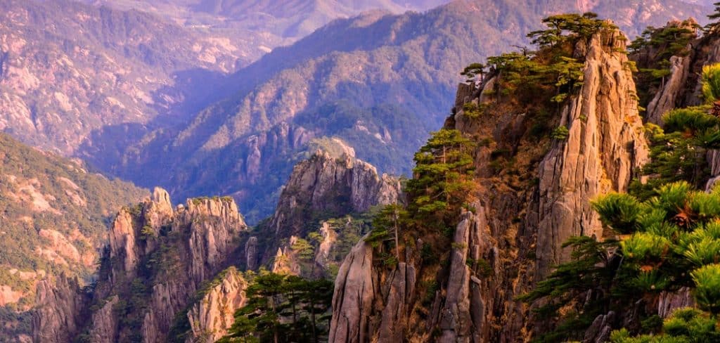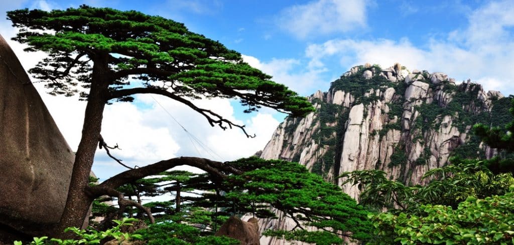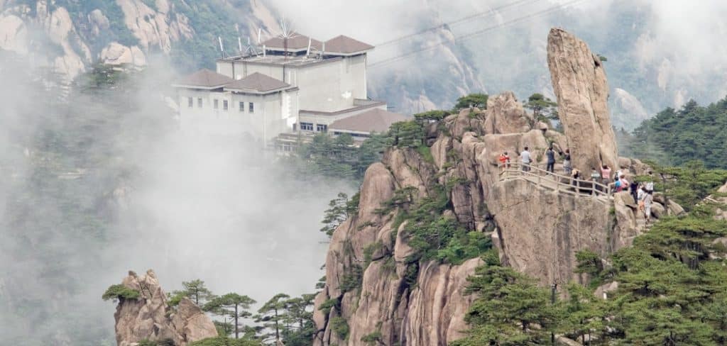Au sommet du Mont Huangshan vous trouverez des sentiers de randonnée mais aussi des promenades qui montent ou descendent vers différents pics. Le panorama se déploie sur de vastes vallées de granit et d’énormes formations rocheuses surmontées de pierres défiant les lois de la pesanteur et d’innombrables pins noueux du Huangshan.