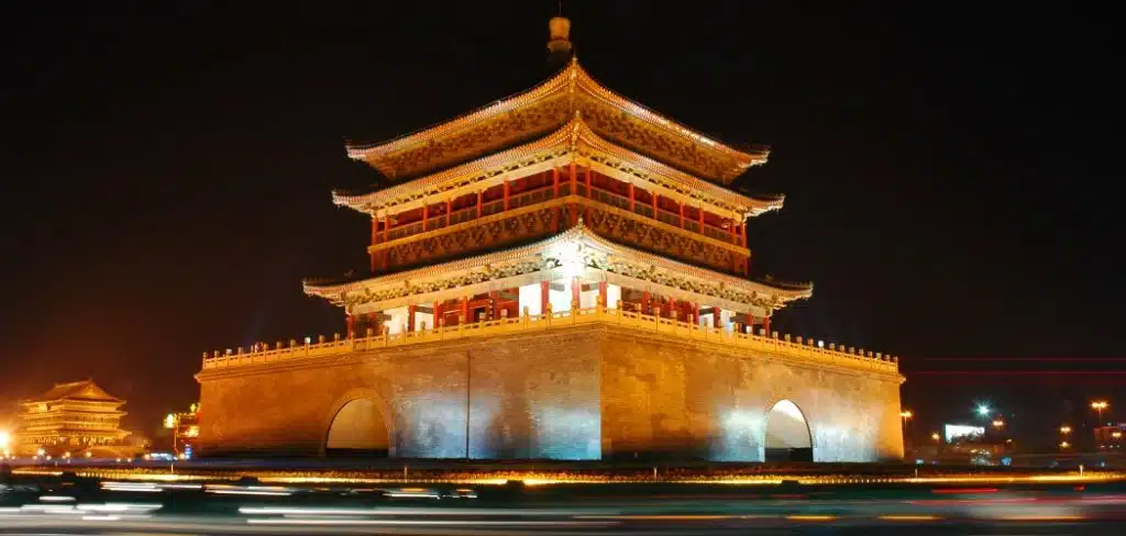 Traditionnellement, la Tour de la Cloche marque le centre de la ville, sa grande cloche de fer rythmait les heures de la vie à Xi’an. La tour d’origine fut construite à la fin du XIVème siècle, puis rebâtie en 1739 sous les Qing.
